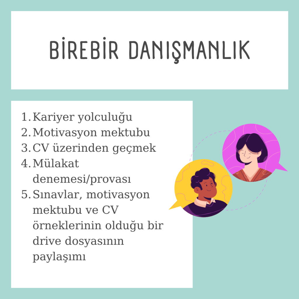 Genel eğitime ek olarak birebir danışmanlık da alabilirsiniz. Sizinle birebir görüştüğümüz zaman diliminde aşağıdaki konular üzerine konuşuyor olacağız: