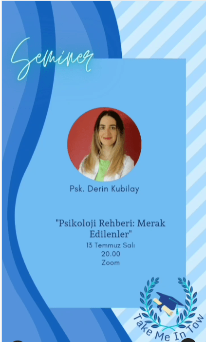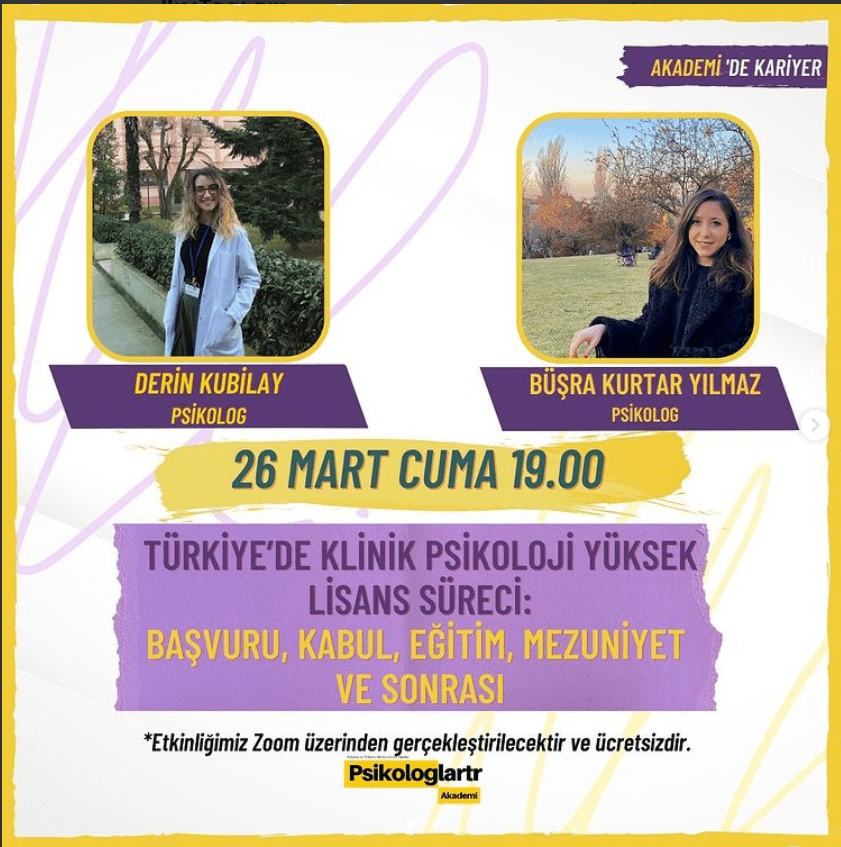 We organize psychology events and activities with undergraduated students under the root of “Psychology Mentorship” founded by me. Our first event will be “Master’s on Psychology: Graduated & Undergraduated Meeting”. Psy. Derin Kubilay will talk about clinical psychology, Psy. Havva Nur Kan will talk about coples and family therapies, and Psy. Simay Bayatlı will talk about clinical neuropsychology.