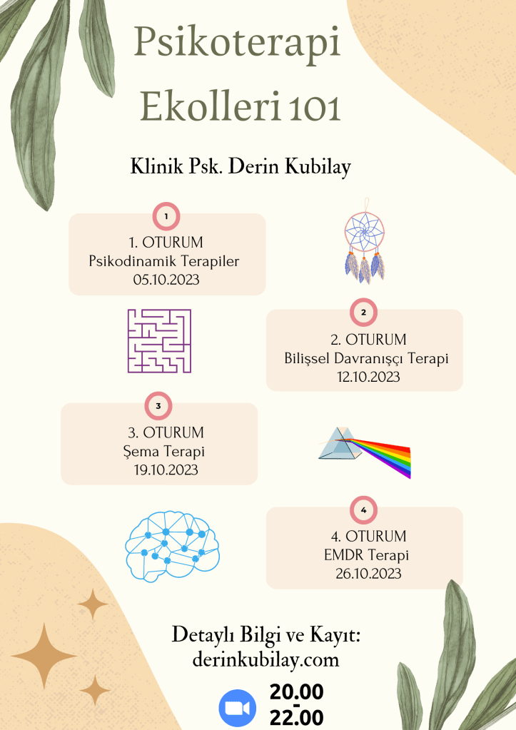 Psikoloji ekollerine dair bilgi, psikoloji lisans eğitiminde kısa ve özet halinde verilir. Daha sonrasında yüksek lisansta ayrıntılı hale getirilerek derinleşir. Yüksek lisansa ek olarak, bu ekollere dair verilen özel eğitimler ile terapistler belli bir ekolde uzmanlaşır. Ancak buradaki sorun şudur ki lisans hayatında ekoller hakkında çok az bilgi sahibi olduğumuz için hangi ekolden eğitim alacağımıza dair zihnimizde pek çok soru işareti oluşur: BDT eğitimi bana uygun olacak mı? Bu yüksek lisans psikodinamik temele dayanıyor; ancak bu ekolü sevecek miyim? EMDR terapisi de ne demek; lisans hayatımda yalnızca ismini duydum! Bu yüzden Psikoterapi Ekolleri 101 Giriş Seminerleri ile ekollere dair bilginizi arttırarak terapist yolculuğunuzdaki bu önemli kararı vermenizi kolaylaştırmayı umuyoruz.